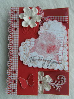 Image: Greeting Farm, swirl stamp (BG), text stamp free gift; coloured with ProMarkers, Versafine satin red + clear ep; Memories Mist; papers Basic Grey's (my favourite's). Big flower self made, heart brad, swirls made with Marianne design's dies. And to these challenges: